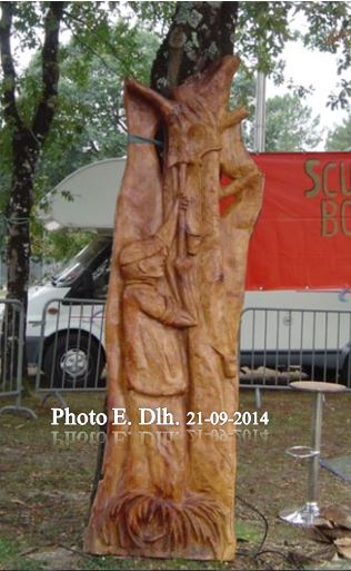 Sculpture réalisée à la tronçonneuse par Bernard Moncé habitant de cette commune et exposé lors de la Foire qui avait lieu le 21.09.2014 à Le Pian (Médoc). Faute d'en avoir trouvé un vrai, j'ai acheté un cèpe sculpté dans du bois de chêne.