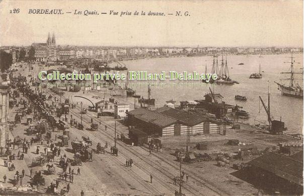 Le Port de la Lune animé par le travail des hommes et des animaux, dominé par les clochers de l'église Saint-Louis des Chartrons faisant pendant aux mâts des voiliers sur la Garonne ?.