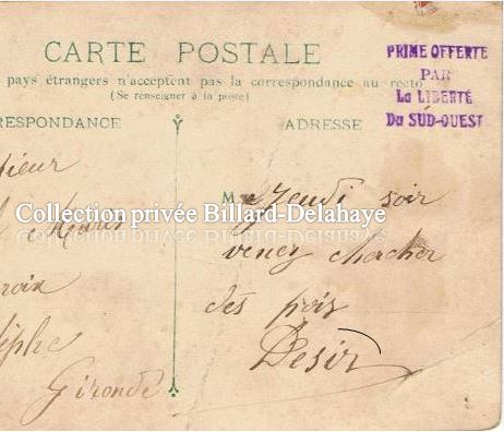 Ce tampon apposé au verso de cette carte postale, "prime offerte par la Liberté du Sud-Ouest", m'a interpellée sur sa signification. Mes recherches m'ont amenée sur le site des Archives Départementales de la Gironde.