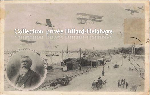 DE MERIGNAC BEAU-DESERT au PORT DE LA LUNE à BORDEAUX. En médaillon le président A. Fallières. Antoinette, Blériot et autres ont fait rêver toute une jeunesse,nous les retrouvons en 1918 dans le film "apocalyspe".Ici Bielovucic est remarquable.