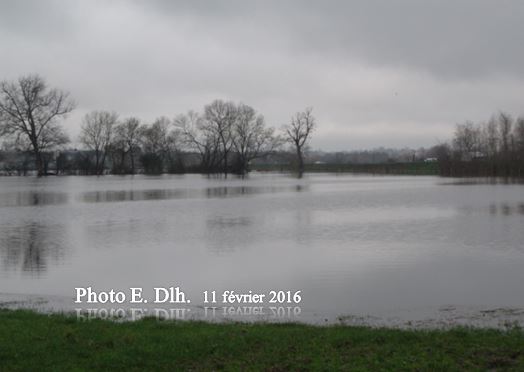 Prairie entre l'av du Port du Roy, l'av du Bois et la Jalle, le 11 février 2016. Les nombreuses mouettes se sont envolées à notre arrivée. L'eau qui avait baissé avant 9h ce matin, 12.02, est remontée à partir de 10h.30.