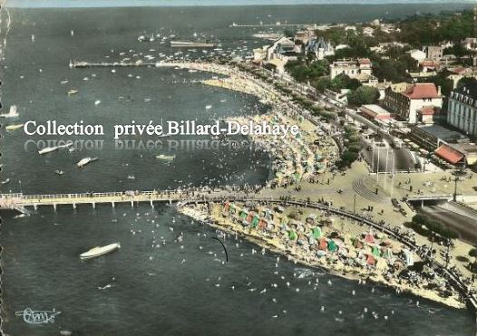 Belle perspective sur la Plage. Vers le 15 août 1961 il ne faisait pas beau à Arcachon, ville qui en 2015 attire beaucoup de touristes par la richesse de son patrimoine, de ses illuminations et ses commerces ouverts le dimanche.