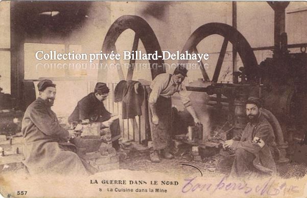 La cuisine dans la Mine. Envoi le dimanche 13.02.1916, après la messe dite par leur aumonier, à la petite Nénette fille de M. Maris dans le Médoc. Dans le nord il fait mauvais temps depuis 3 jours...