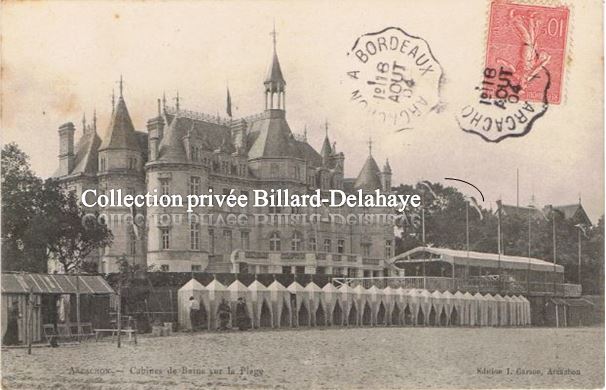 Sur le cachet ondulé du convoyeur Arcachon à Bordeaux on lit la date du 18.08.1904. Cette CPA a été envoyée par Jeanne la soeur de M. P. ELIE, 28, rue Montgolfier à Bordeaux.