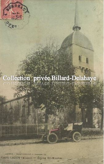 LUDON (Médoc). UNE VOITURE DEVANT L'EGLISE EN 1900.