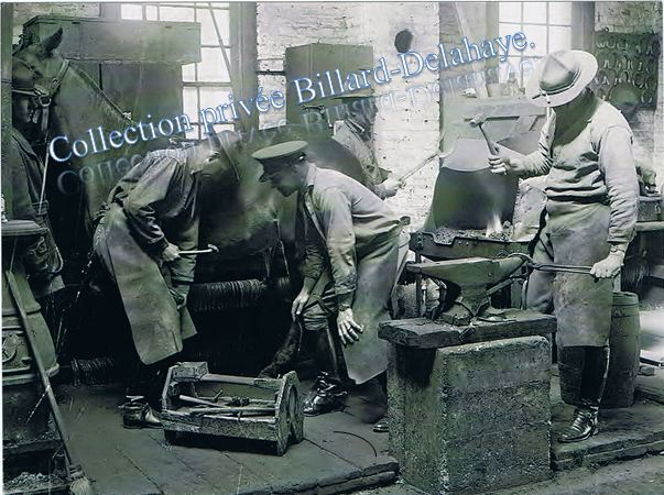 Canada, maréchaux ferrants de la police montée, 1915-1930. La forge est en pleine action, ajustage du fer sur l'enclume, etc...